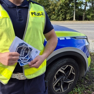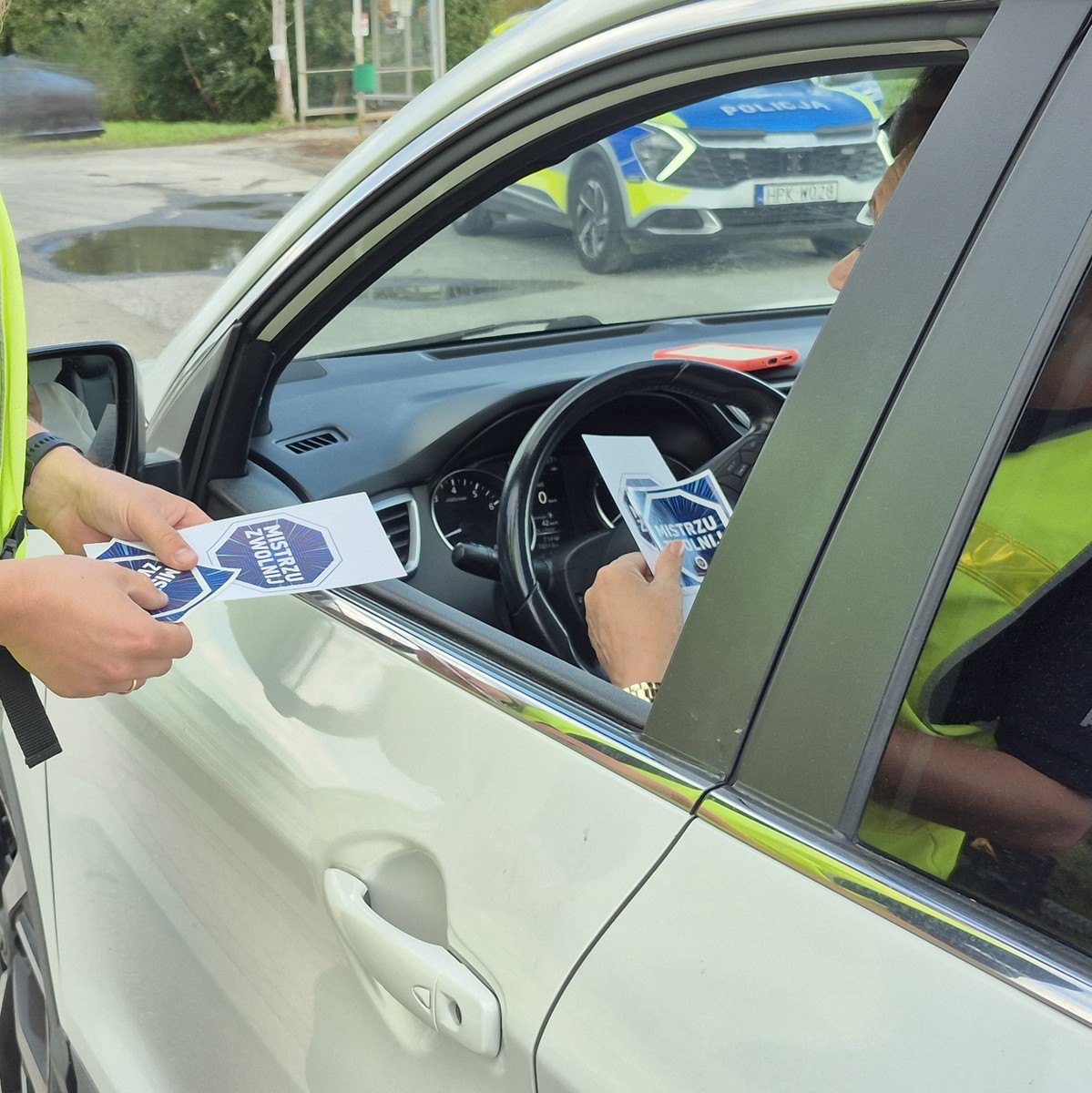 Policjanci z Wydziału Ruchu Drogowego KPP w Strzyżowie podczas kontroli drogowej promowali założenia kampanii pn. „Mistrzu, zwolnij”. Wręczali kierującym ulotki i naklejki promujące wspólną kampanię PZU i Policji.