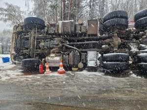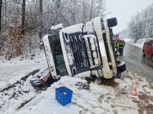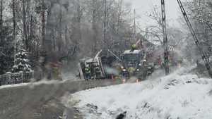 Do zdarzenia doszło dziś po godz. 8, na odcinku drogi wojewódzkiej 989, w miejscowości Żyznów. Ze wstępnych ustaleń policjantów pracujących na miejscu wynika, że 31-letni mieszkaniec woj. mazowieckiego, kierujący ciągnikiem siodłowym z naczepą i ładunkiem, zjechał na grząskie pobocze i częściowo zablokował jeden z pasów ruchu. Chwilę później, tym samym odcinkiem drogi, poruszał się inny zestaw pojazdów, który przewoził drewno. 42-letni mieszkaniec powiatu strzyzowskiego, kierujący tym zestawem, chcąc uniknąć zderzenia, również zjechał z jezdni co spowodowało przewrócenie się zestawu pojazdów na bok.