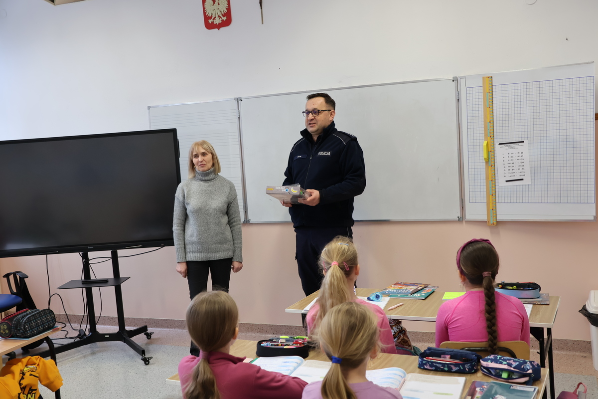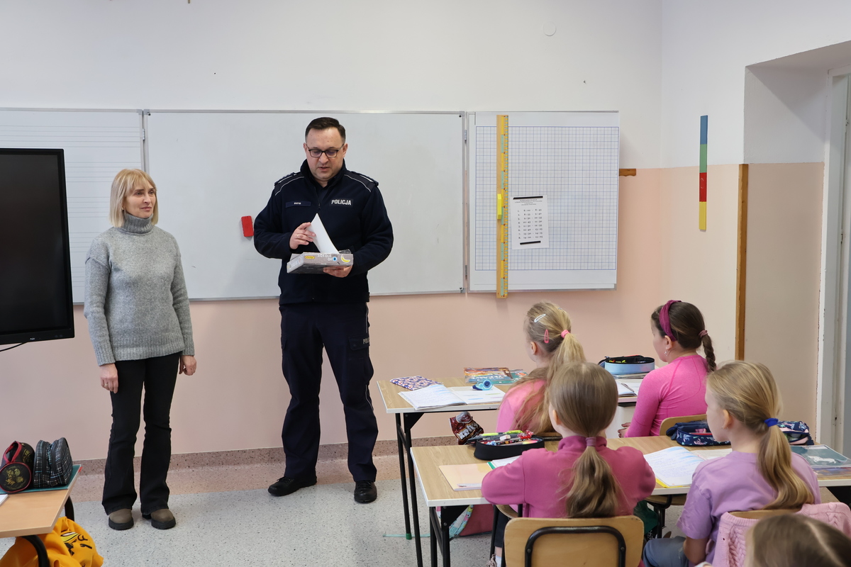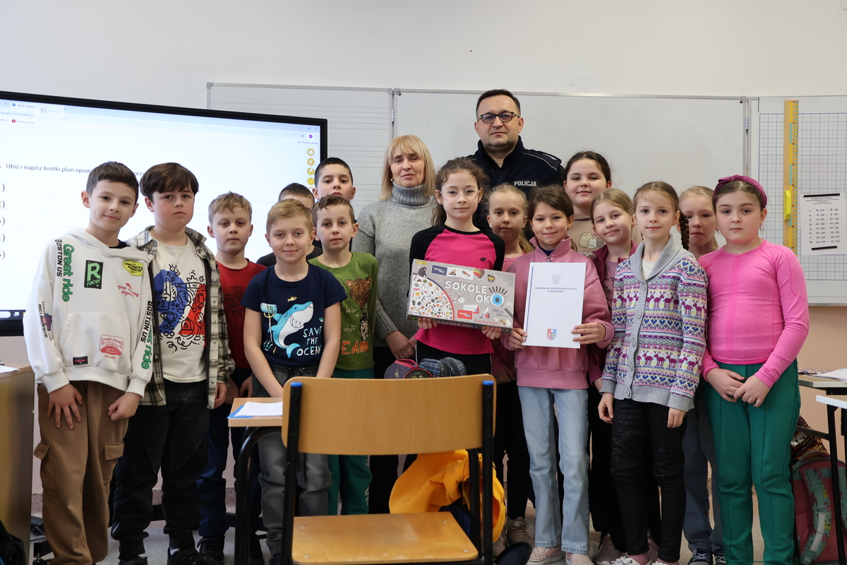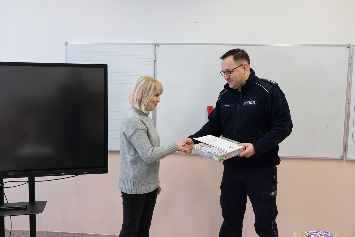 W uznaniu za zaangażowanie i innowacyjne podejście do tematu bezpieczeństwa, szkołę odwiedził Naczelnik Wydziału Ruchu Drogowego Komendy Powiatowej Policji w Strzyżowie. Podczas spotkania przekazał on na ręce społeczności szkolnej nagrodę w postaci edukacyjnej gry planszowej oraz pamiątkowy dyplom za uczestnictwo.